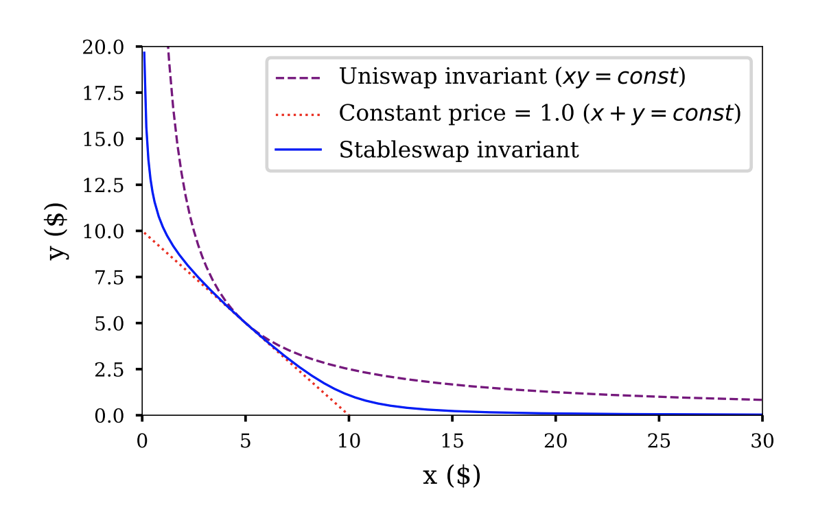 上图中蓝色曲线即代表StableSwap。可以看到在相对价格在1左右时该曲线贴近恒定和曲线,在价格显著偏离1时更贴近恒定乘积曲线。